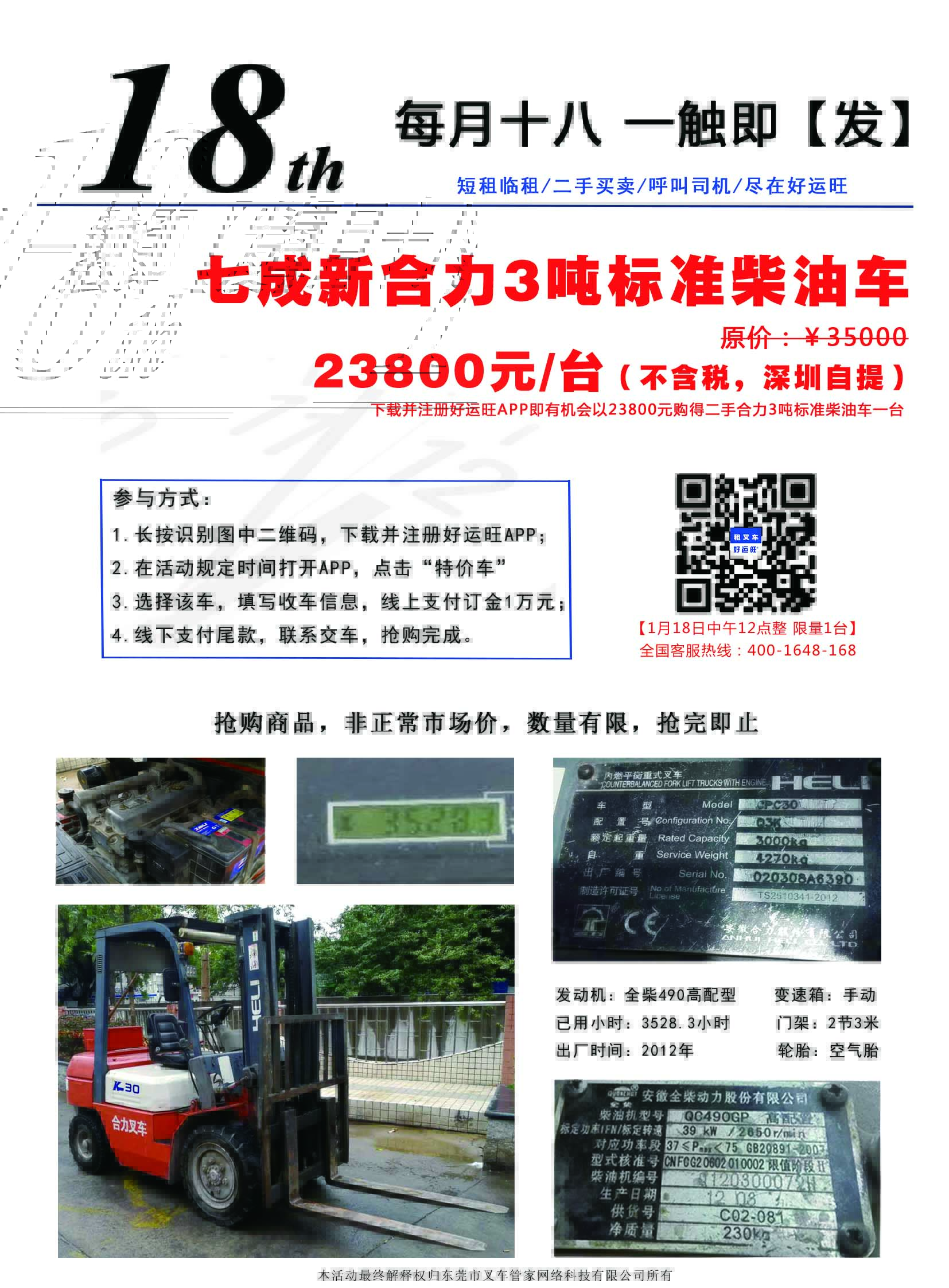 感谢各位对好运旺租叉车活动的关注和热情参与,在好运旺APP1月18日的抢购活动中,由安徽六安的用户成功抢购到七成新合力3吨标准柴油叉车一台,用户手机尾号为8143,仅用时39秒。现将抢购活动中的截图展示如下: